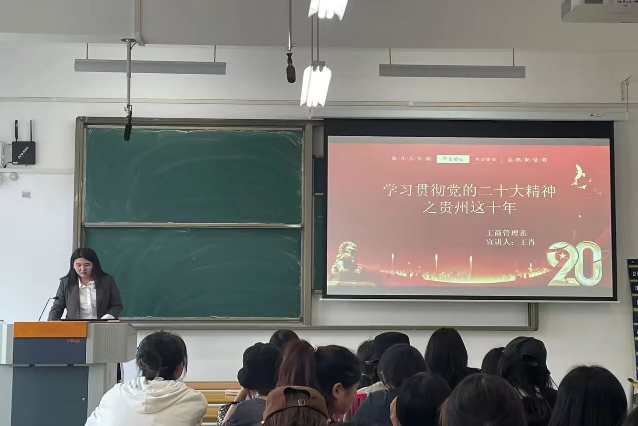 4月14日,王肖老师以“学习贯彻党的二十大精神之贵州这十年”为题,为市场营销203班、204班学生宣讲。宣讲从党的二十大基本内容、贵州这十年、当代大学生如何做三方面展开。4月25-28日,宣讲团成员尹晓龙、李梦迪、刘章法同学为该系2022级同学宣讲。