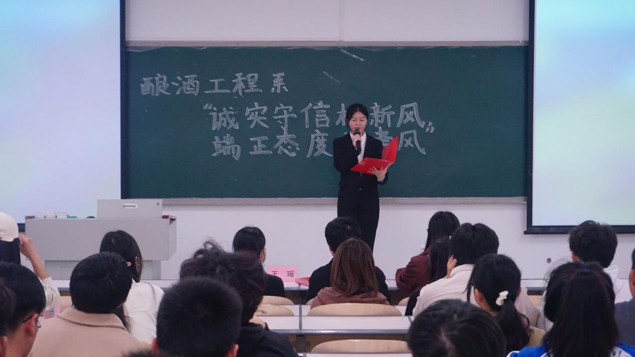 酿酒工程系党总支副书记刘晓晓老师宣读学生手册中诚信考试相关内容,告诫全体同学,考试作弊将取消学生考试资格,严重者将给予处分、开除学籍等处罚。刘晓晓老师强调,学生干部、学生党员应以身作则,发挥模范作用,自觉遵守考场纪律,以实际行动维护考场秩序。