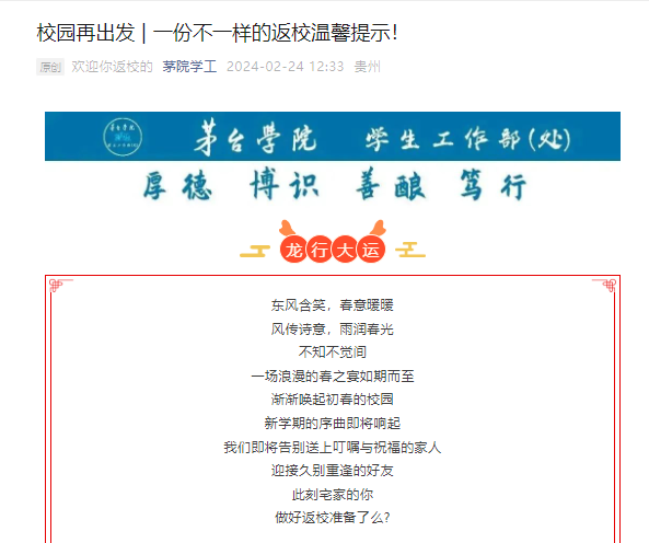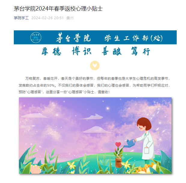针对全体学生,持续强化返校安全、心理健康、传染病防治等重点领域宣传教育,结合春季学期开学时间节点,通过今年会学工公众号发布《校园再出发 一份不一样的返校温馨提示!》《今年会官方网站2024年春季返校心理小贴士》《春季开学心理调试》《新学期,新气象,共防结核守健康--贵州疾控致学生及家长的一封信》等文章,提醒学生密切关注宿舍用电、自身心理健康及传染病预防等安全知识,帮助学生提升安全防范意识,加强自我保护能力。