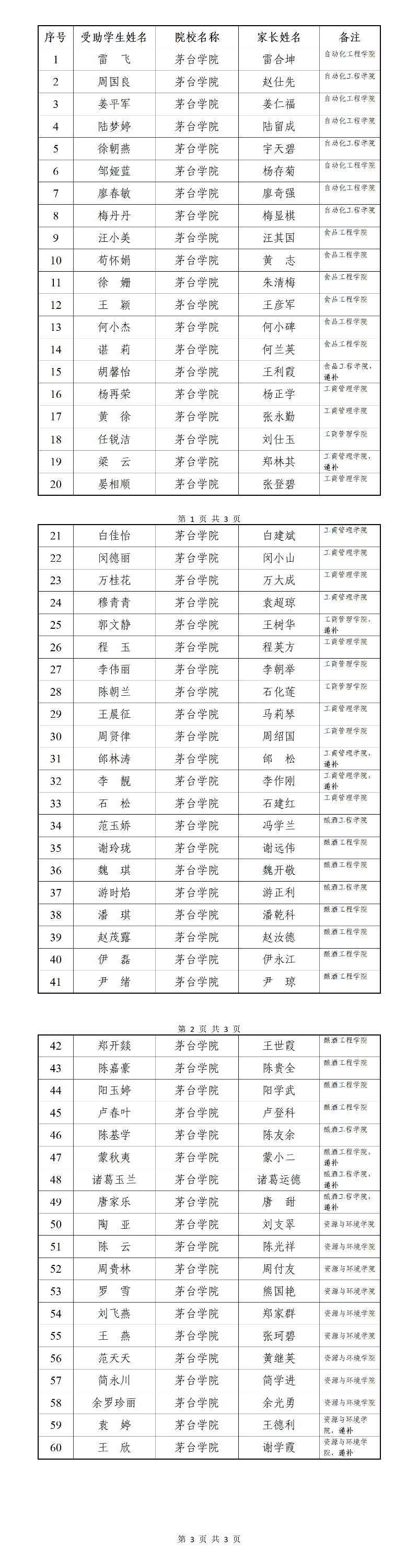 根据“中国茅台·国之栋梁——2022希望工程圆梦行动大型公益助学活动”资助管理规则,通过学生本人申请,经二级学院审核推荐、公示,确定60人受助。现将名单公示如下: