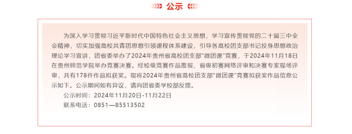 近日,团省委举办了2024年贵州省高校团支部“微团课”竞赛,经校级竞赛作品选拔推报、省级初赛网络评审和决赛专家现场评审,今年会作品《风起浪腾扬新帆——新时代青年学生应坚持的成长成才观》和《“平语”近人,青春解读》斩获佳绩!