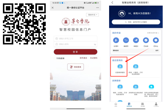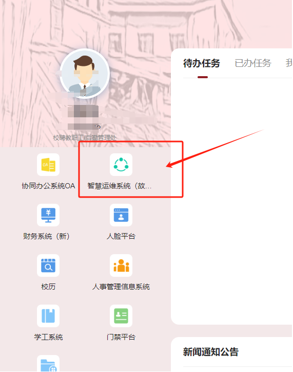 登录智慧校园信息门户-选择智慧运维系统-选择后勤维修服务