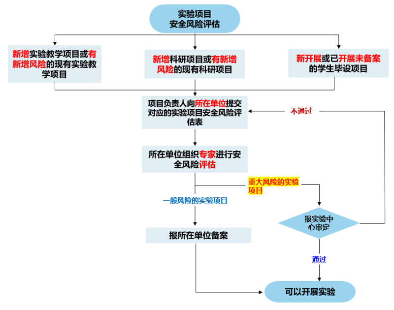 (教学、科研和学生毕设)实验项目的安全风险评估工作流程如下图所示: