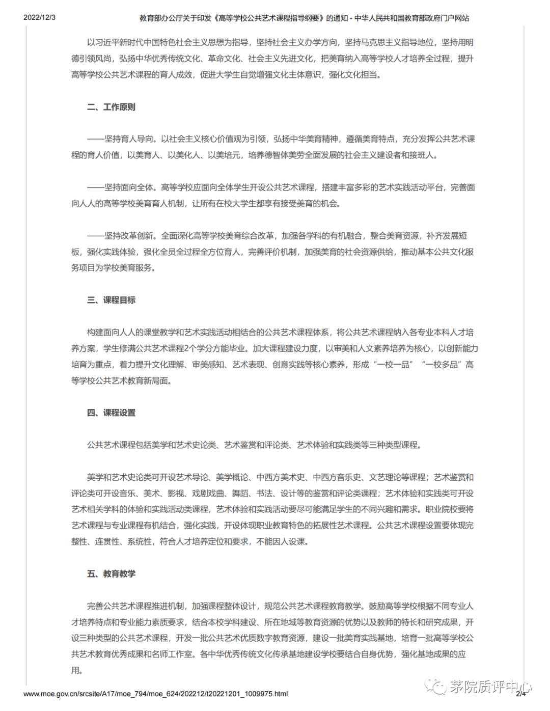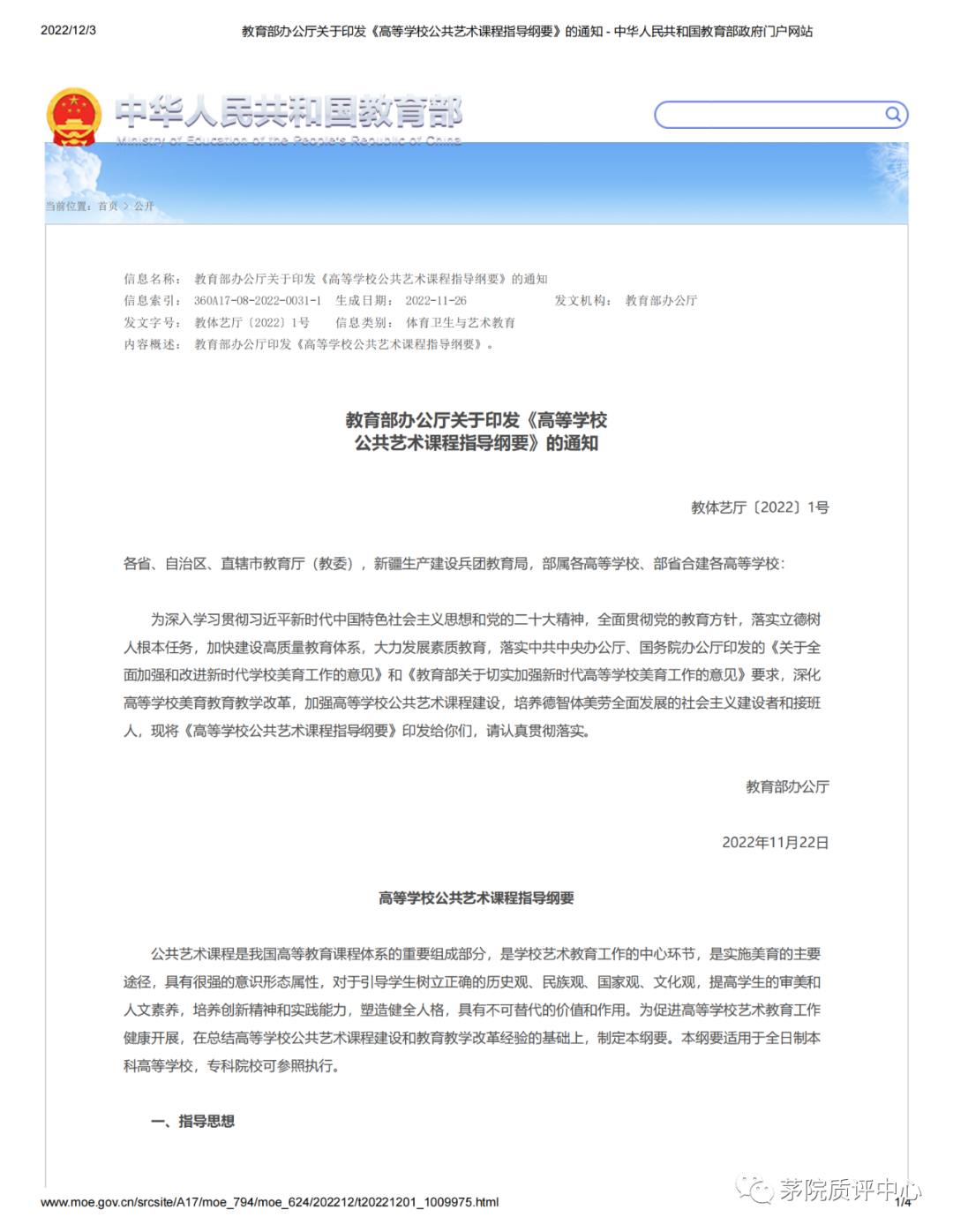 2022年11月26日,《教育部办公厅关于印发<高等学校公共艺术课程指导纲要>的通知》发布。下面分享《通知》全文,供大家学习。