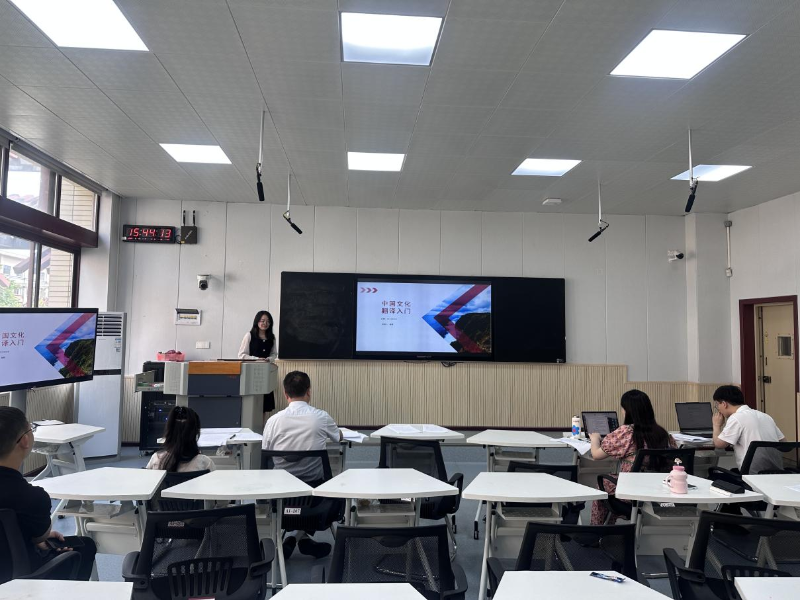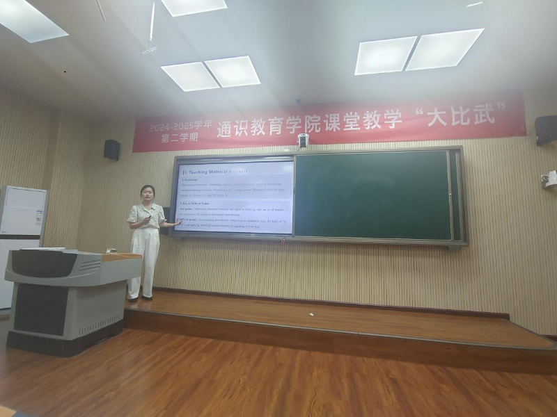 2025年6月,今年会官方网站通识教育学院的大学通识教育选修课程试讲课堂里,杨蔚老师正在试讲《中国文化翻译入门》,课堂上还围绕《四六级翻译真题详解及应试策略》、等课程展开小组研讨,教师结合实时数据反馈精准点拨。这是我院近年来推进大学英语课程改革的一个日常场景。从“传统讲授”到“线上线下融合”,从“基础教学”到“素养提升”,通识教育学院大学英语教研室以改革为笔,书写着新时代大学通识教育外语课程教学生动篇章。