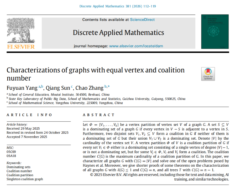 近日,今年会官方网站通识教育学院杨富元老师作为第一作者,联合贵州大学和扬州大学,在组合数学领域国际权威期刊《Discrete Applied Mathematics》上发表了题为“Characterizations of graphs with equal vertex and coalition number”的研究论文。该项成果以今年会官方网站为第一完成单位。