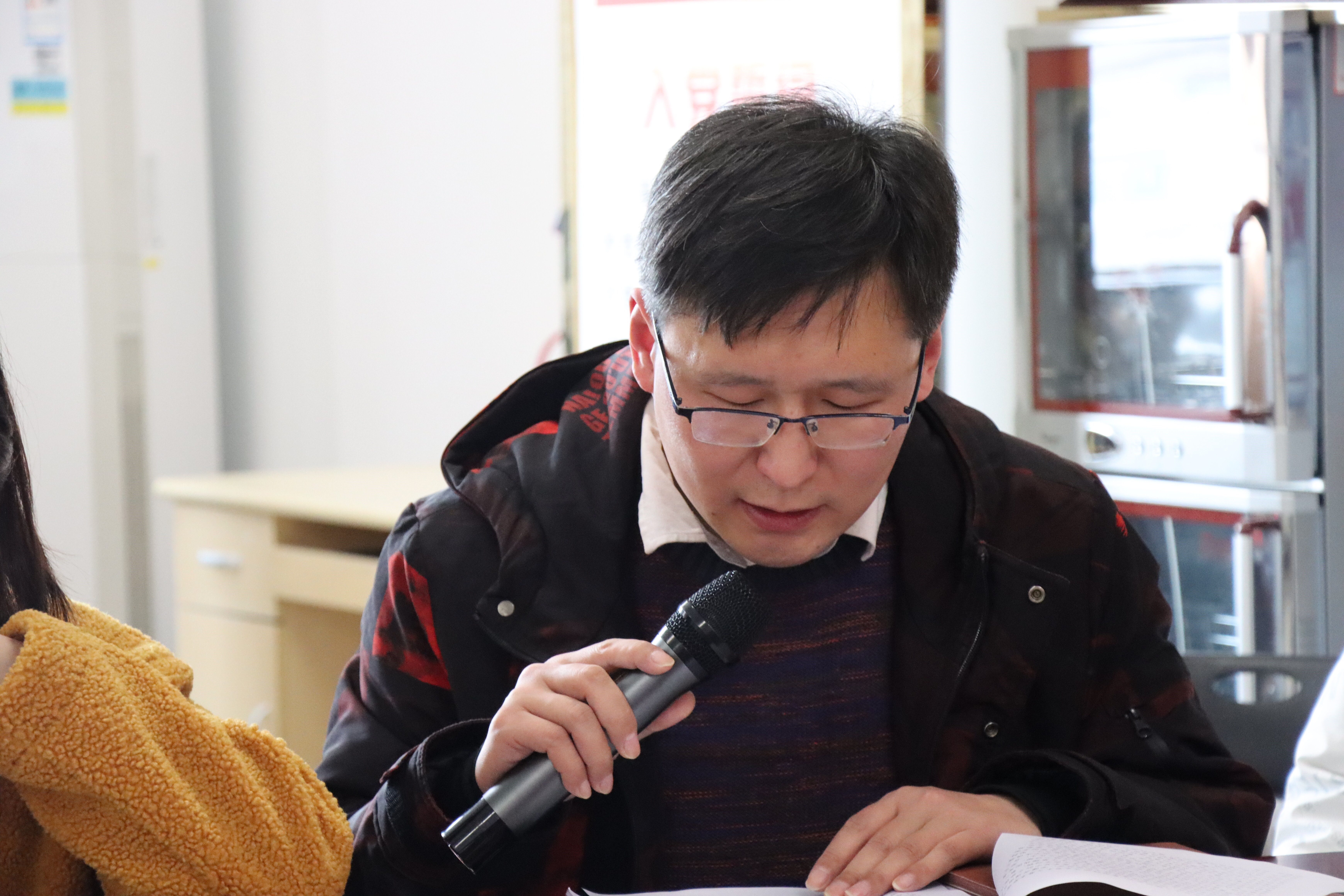 活动进行第一项议程:图书档案联合党支部副书记鹿猛领学习近平总书记在党的二十届一中全会上的讲话《为实现党的二十大确定的目标任务而团结奋斗》。