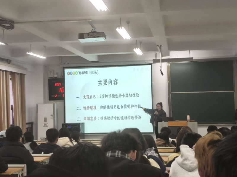 讲座中,吴婷婷老师以FPA性格色彩理论为核心,用生动案例拆解红色、蓝色、黄色、绿色四种性格色彩的核心特质。针对大学生恋爱中的常见困惑,吴老师重点分析不同色彩性格在情感表达、沟通方式、需求偏好上的差异。红色性格的热情直率、蓝色性格的细腻敏感、黄色性格的果断坚定、绿色性格的温和包容,让在场学生快速定位自身“恋爱色”。