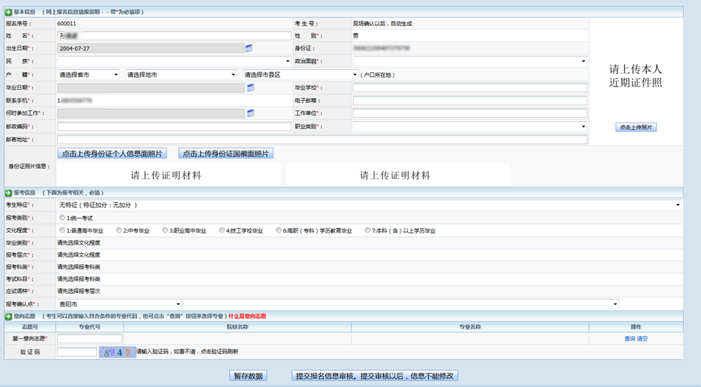 提交数据:提交报名信息到报名点审核,系统会检查数据的逻辑性,如果有问题,会提示考生修改。数据提交审核以后,信息将不能修改。