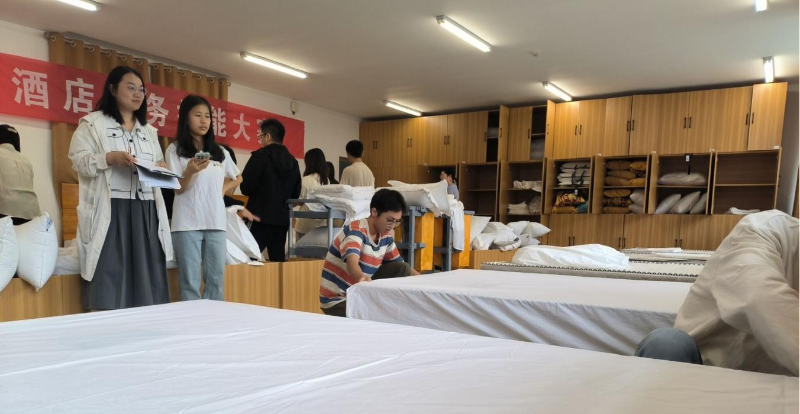 在中式铺床现场,学生熟练流畅的操作,较好做到平整的床铺和温馨的床品布置,充分展示了学生在酒店服务各个环节的技能素养。