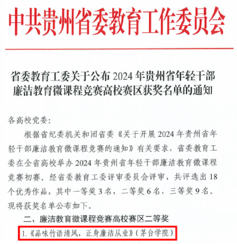 根据《省委教育工委关于公布2024年贵州省年轻干部廉洁教育微课程竞赛高校赛区获奖名单的通知》,我院推荐教师程奥林录制的微课程《品味竹语清风,正身廉洁从业》荣获高校赛区二等奖。
