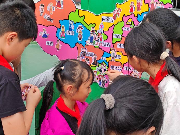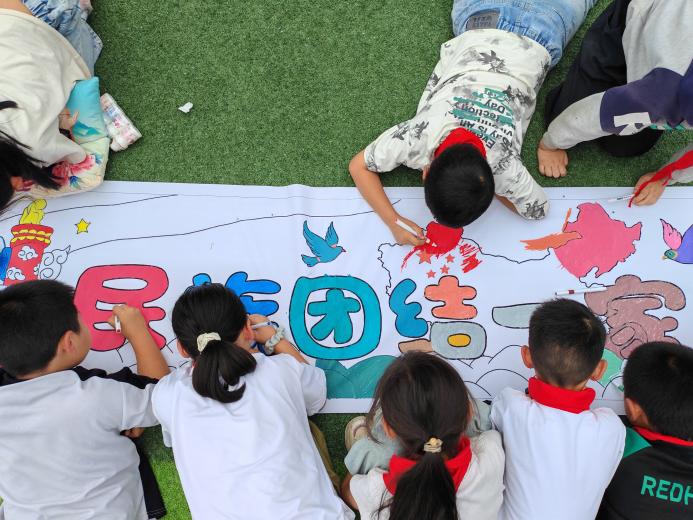 “我国人口最多的少数民族是什么?”“仁怀本地主要居住着哪些少数民族?”在“民族知识我知道”互动问答环节,农保小学的同学们踊跃举手、积极抢答,清脆的回答声此起彼伏。农保小学的同学们还用画笔在民族团结画布上涂色、创作,现场满是画笔摩擦纸张的沙沙声与孩子们的欢声笑语。