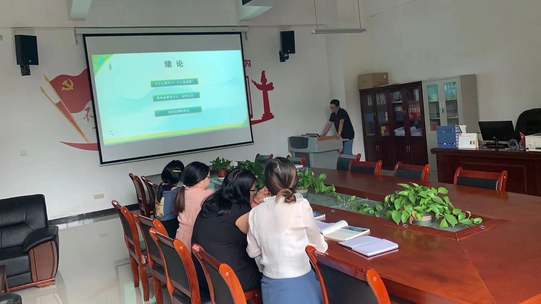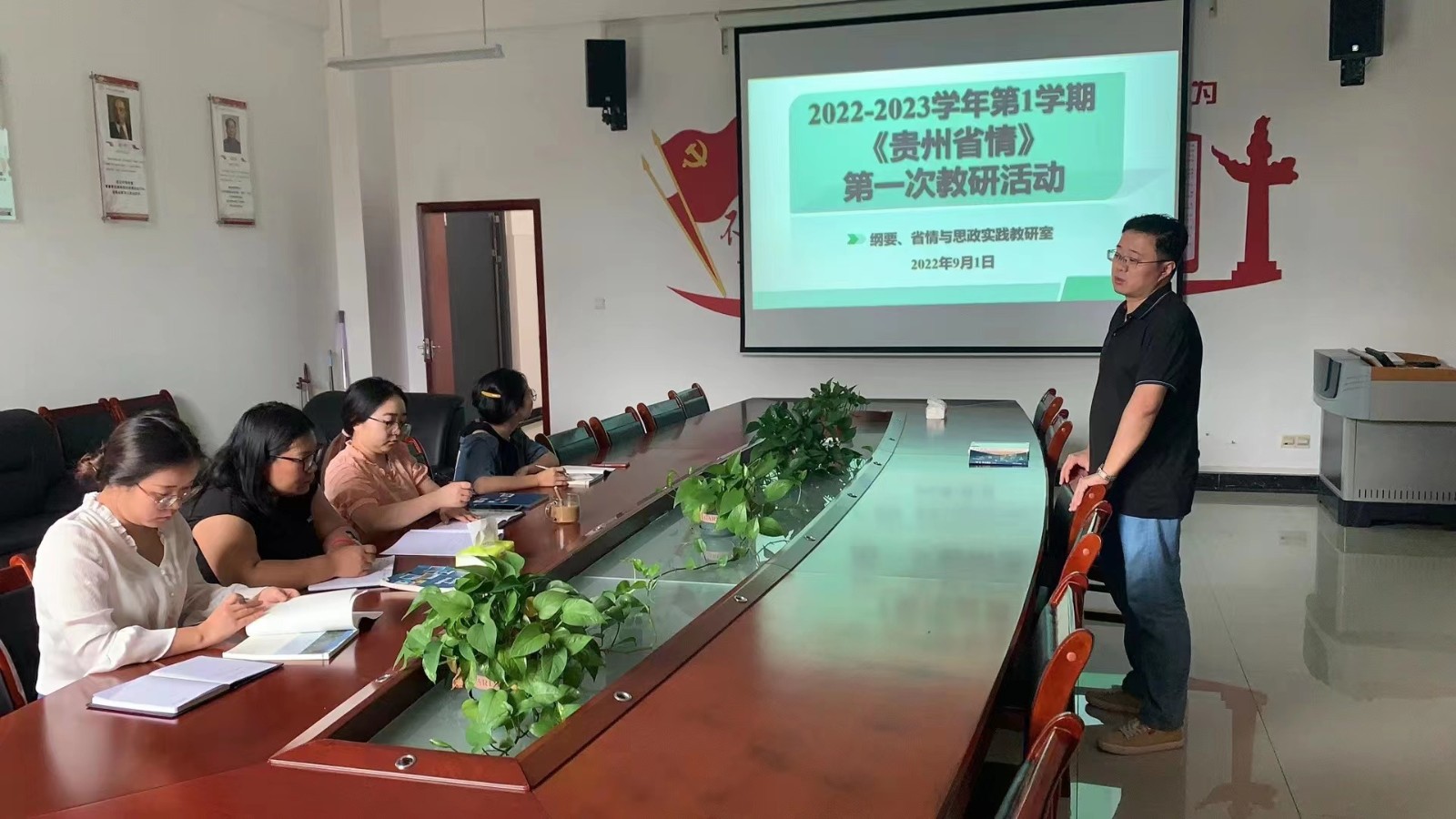 根据教研室“大练兵”计划安排,2022年9月1日下午,纲要、省情与思政教研室在留芳楼118办公室开展本学期第一次教研活动,《贵州省情课》课程组5位教师参加教研。教研室主任李志勇作为《贵州省情》绪论部分主要备课教师,结合自己五年来讲授《贵州省情》课程的经验和感悟,就绪论内容进行了说课,为大家分享了自己的教学设计和教学方法。