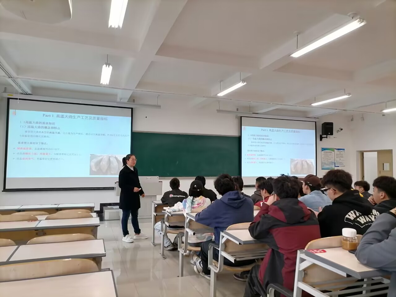 2023年3月24日,贵州茅台酒股份有限公司制曲三车间主任王成叶到校为我系学生授课。围绕高温大曲,王主任结合多年生产经验,详细讲授了制曲工艺和大曲质量控制两方面的内容。授课过程中,王主任将知识点融合生产实例,生动形象地向学生们分享了制曲相关技术。同学们兴趣盎然,纷纷表示高温大曲的传统生产工艺技术性较强,希望本学期实习能够到制曲车间进一步学习,加深理解。