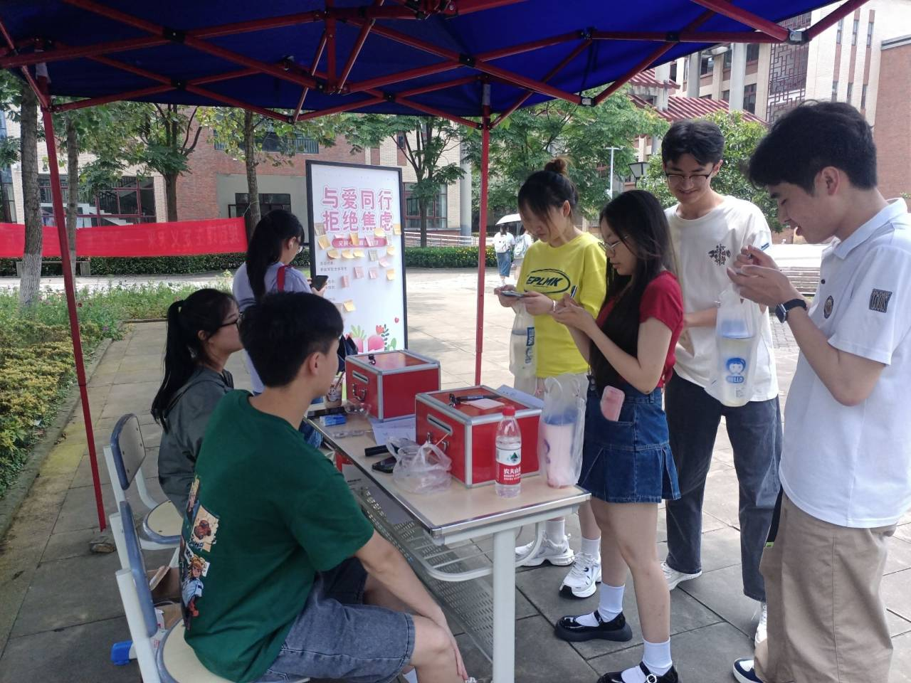 本次活动旨在提供一种解压的方式,帮助同学们缓解自身的焦虑。现场设置有“安慰盲盒”和“焦虑盲盒”,同学们可以通过抽取两个盲盒中的内容获取安慰或者解答焦虑。活动一开始就吸引了众多学生驻足围观,面对结伴来了解活动信息的同学,工作人员耐心细致地讲解活动流程并且递上便签和笔,让他们能快速了解活动并参与。