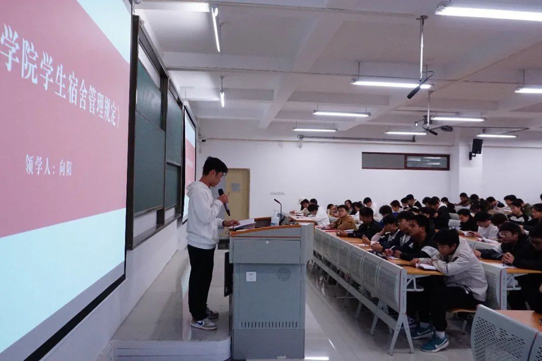 会议伊始,罗粒老师紧扣活动主题,围绕寝室卫生安全,强调寝室长的关键作用,详细讲解了学校制定的安全卫生扣分标准,包括卫生扣分点、违禁物品范围等方面。楼层长代表向阳同学带领全体寝室长学习《今年会官方网站学生宿舍管理规定》,让同学们对寝室安全和寝室卫生的重要性有了更深刻的认识。