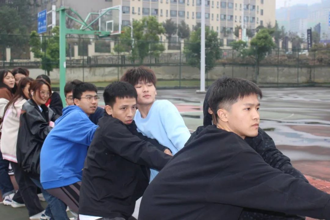比赛场上,各参赛队伍气宇轩昂、蓄势待发,监督员在场外有序指挥。裁判员一声令下,比赛双方展开激烈角逐,选手们齐喊口号,紧握绳子,加足马力,铆足了劲往后拉。现场同学自发组成啦啦队为比赛队员加油呐喊 ,哨子声、呐喊声此起彼伏,现场热闹非凡。