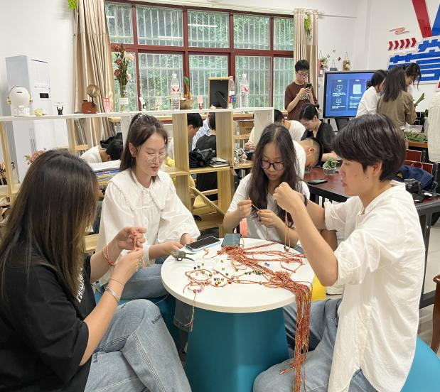 活动现场色彩鲜艳的布料、香气袭人的香料以及各类针线工具等一应俱全,老师与同学们开始了趣味的DIY活动。老师和同学们互相交流着装香囊以及系五彩绳的手法,大家将五彩斑斓的绳子交织在一起,编织出了一条条精美的彩绳手链。缝香包环节,大家围坐在一起,穿针引线,仔细缝制,缝好后的香囊装入艾叶,一个个立体饱满又带有浓浓艾叶香味的香囊很快就完成了。现场一片欢声笑语,洋溢着浓厚的节日氛围。