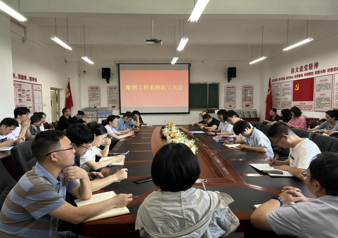 为全面加强系部建设与管理,进一步推动系部工作高质量发展,酿酒工程系于2024年5月23日上午10:00召开全系教职工大会。会议由我系党总支书记、系主任郭举同志主持,学院党委委员、副校长张春林同志莅临指导,我系全体教职工参会。