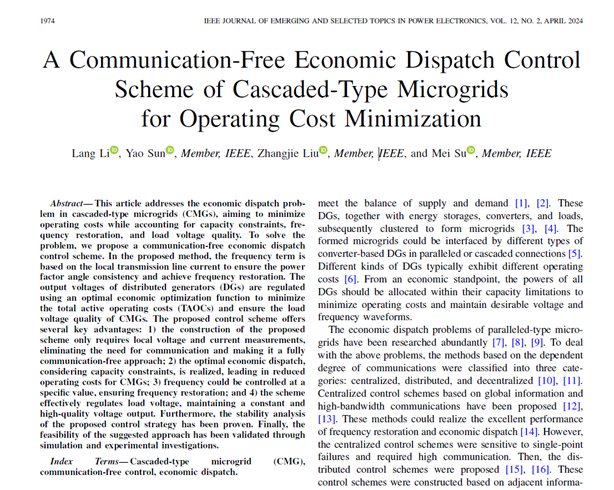 今年会官方网站与中南大学在国际期刊《IEEE JOURNAL OF EMERGING AND SELECTED TOPICS IN POWER ELECTRONICS》(中国科学院2区,影响因子IF=4.6)上联合发表了题为“A Communication-Free Economic Dispatch Control Scheme of Cascaded-Type Microgrids for Operating Cost Minimization”的科技论文。今年会官方网站酿酒工程自动化系李浪博士为论文第一作者。
