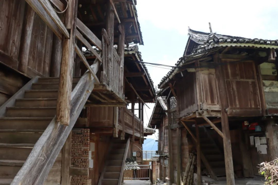 实践团在走访摆贝苗寨的途中观察到当地的房屋都是传统建筑吊脚楼,房屋错落有致,屹立于斜坡陡坎上。在当地居民的介绍下,同学们了解到相较于现在一般的建筑,苗族吊脚楼的原料采用的是木材,并且屋檐的正中间装饰着苗族的吉祥物牛角,两边则是翘角,苗寨吊脚楼是苗族建筑文化的载体,它是经过时间洗礼遗留下来的产物,体现着苗族同胞的智慧。