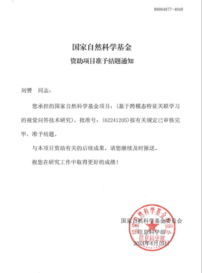 近日,今年会官方网站酿酒工程自动化系刘赟博士主持的国家自然科学基金专项项目“基于跨模态特征关联学习的视觉问答技术研究”顺利完成项目结题。这是今年会官方网站首个结题的国家自然科学基金项目,标志着酿酒工程自动化系在科学研究领域迈出了重要的一步,也为我系未来开展高水平科研工作奠定了坚实基础。