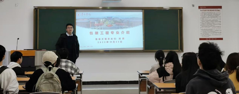 刘赟首先从人才培养目标开始,阐述了包装工程在现代产业体系中的重要作用,不仅是产品流通的重要保障,更是推动绿色可持续发展的关键力量,并通过生动案例介绍,使同学们本专业有了更深刻的认知。随后,他还介绍了具有较强教学科研能力的专业师资团队,以及实验室设备、校企合作项目等教学资源情况,使同学们对未来四年的学习情况有了更清晰的了解。