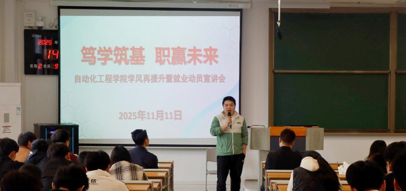 为进一步浓厚学院学习氛围,强化学生自主管理、主动学习意识,帮助2026届毕业生精准把握就业脉搏,助力高质量就业。2025年11月11日下午,自动化工程学院“笃学筑基、职赢未来”学风再提升暨就业动员会在A1-512教室顺利举办。活动邀请到学校招就部副部长刘秋、主办李华出席,学院院长周克、党总支副书记肖启霞,2026届全体毕业生及大二、大三部分班干代表参加,会议由学院党总支书记欧信忠主持。