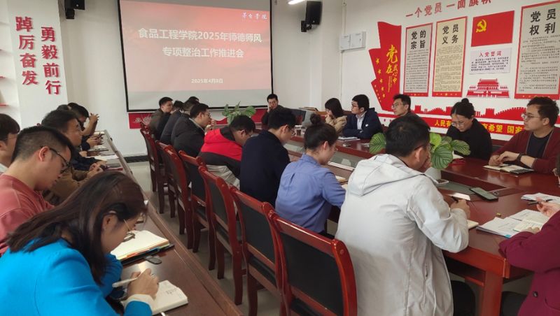 为不断增强学院教职工敬业修德、奉献社会的责任感和使命感,全面推进专项整治行动落细落小落实,引导教职工敬业立学、崇德尚美,营造风清气正的育人环境。4月8日下午,食品工程学院在A2-318会议室召开2025年师德师风专项整治工作推进会,学院班子成员及全体教职员工参加会议,会议由党总支书记布如宇主持。