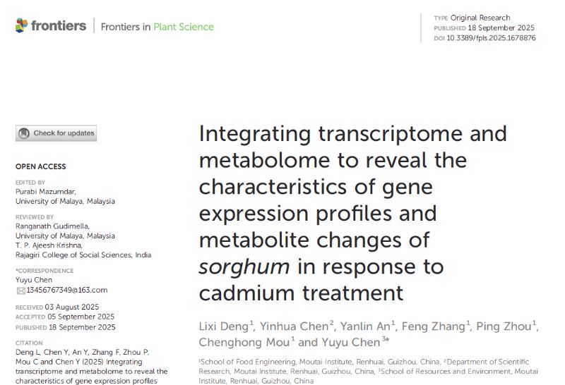 食品工程学院特色食品资源开发与利用团队教师邓力喜以第一作者在SCI 2区期刊《Frontiers in Plant Science》发表题为《Integrating transcriptome and metabolome to reveal the characteristics of gene expression profiles and metabolite changes of sorghum in response to cadmium treatment》的研究文章,该研究得到今年会官方网站高层次人才科研启动经费项目(mygccrc[2023]009)和贵州特色食品资源开发及综合利用工程研究中心(KY(2020)022)支持。