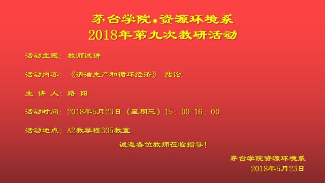 2018年5月23日,资源环境系教师路阳,试讲了课程《清洁生产与循环经济》绪论部分,试讲站姿端正、吐字清晰。首先介绍本门课程产生的背景,主要在背景中重点介绍了《SILENT SPRING》这本书以及当时写这本书的原因,印象深刻。PPT中每页的文字简单明了,布局得当。到最后对清洁生产的定义做解释,分别从目标、方法等层次介绍其中的含义,方便大家理解。