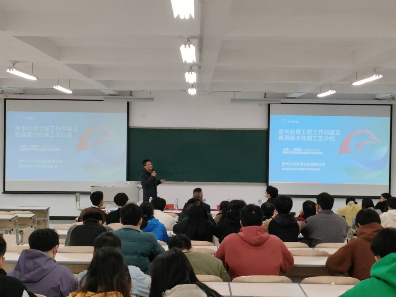 随后,陈阳阳总经理带来了题为“酿酒废水处理工程与处理工艺”的主题讲座,结合公司环保项目,详细介绍了酿酒废水处理工艺和工程实践,帮助大家更加深入地了解了废水处理工艺和从业工作内容。同时,陈阳阳总经理强调了实践的重要性,其一是提高就业竞争力和实践经验,其二是培养实际操作能力和解决问题的能力,其三是加深对理论知识的理解和应用,并鼓励大学生主动深入实践,在实践中感悟理论、成长成才。