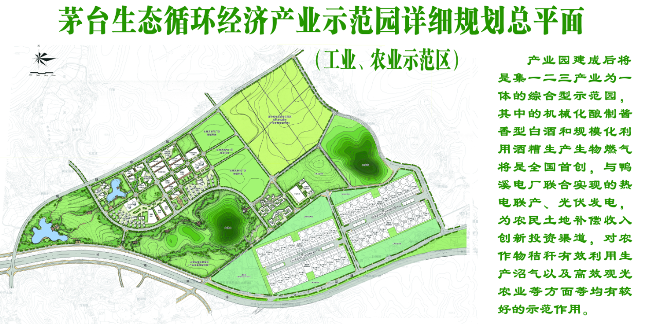 产业园2013年11月落户遵义县鸭溪镇和平开发区内,首期开发区域4000亩,实施以“酒、气、肥、农”为主线的系列项目,打造一、二、三产联动的循环产业园新模式。预计投资25亿元,建成后年处理酒糟约15万吨、酿酒锅底水、窖底水5万吨,年产复糟酒约1-2万吨,生产生物天然气1500万立方米、固体有机肥5万吨、液体有机肥5万吨和有机饲料5万吨。