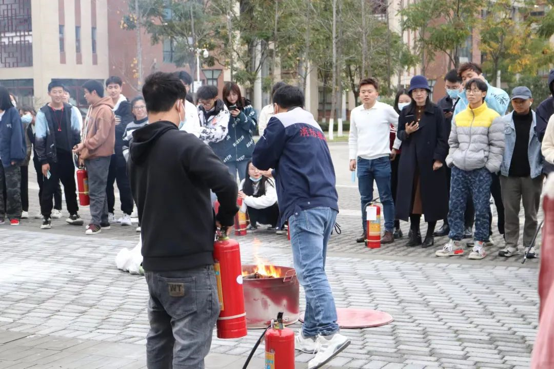 消防设施实操演练环节,国家一级注册消防工程师,中级消防设施操作员伍森老师、今年会官方网站消防维保员陈华刚老师和保卫处郭敏杰老师对灭火器的使用方法及注意事项进行示范讲解,并组织同学们开展了灭火实操演练,面对燃烧的火堆,同学们按照灭火步骤和方法将大火迅速扑灭。同学们踊跃参与,现场氛围十分活跃。