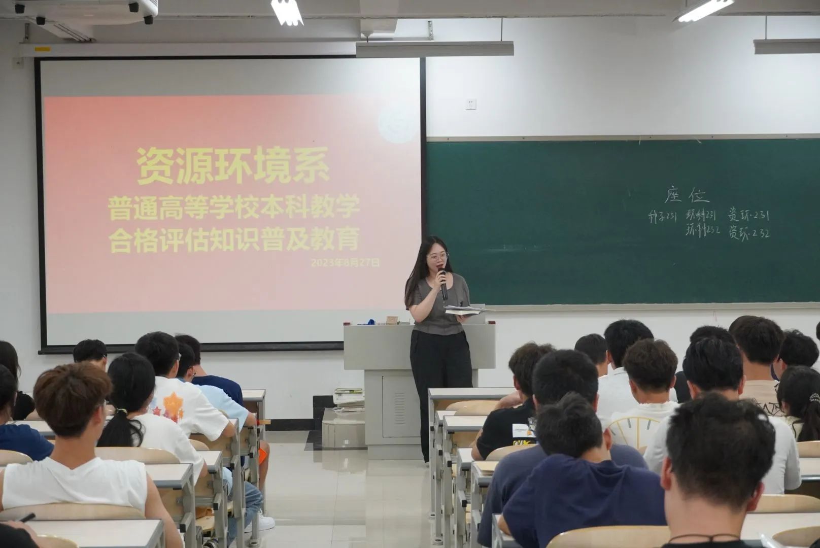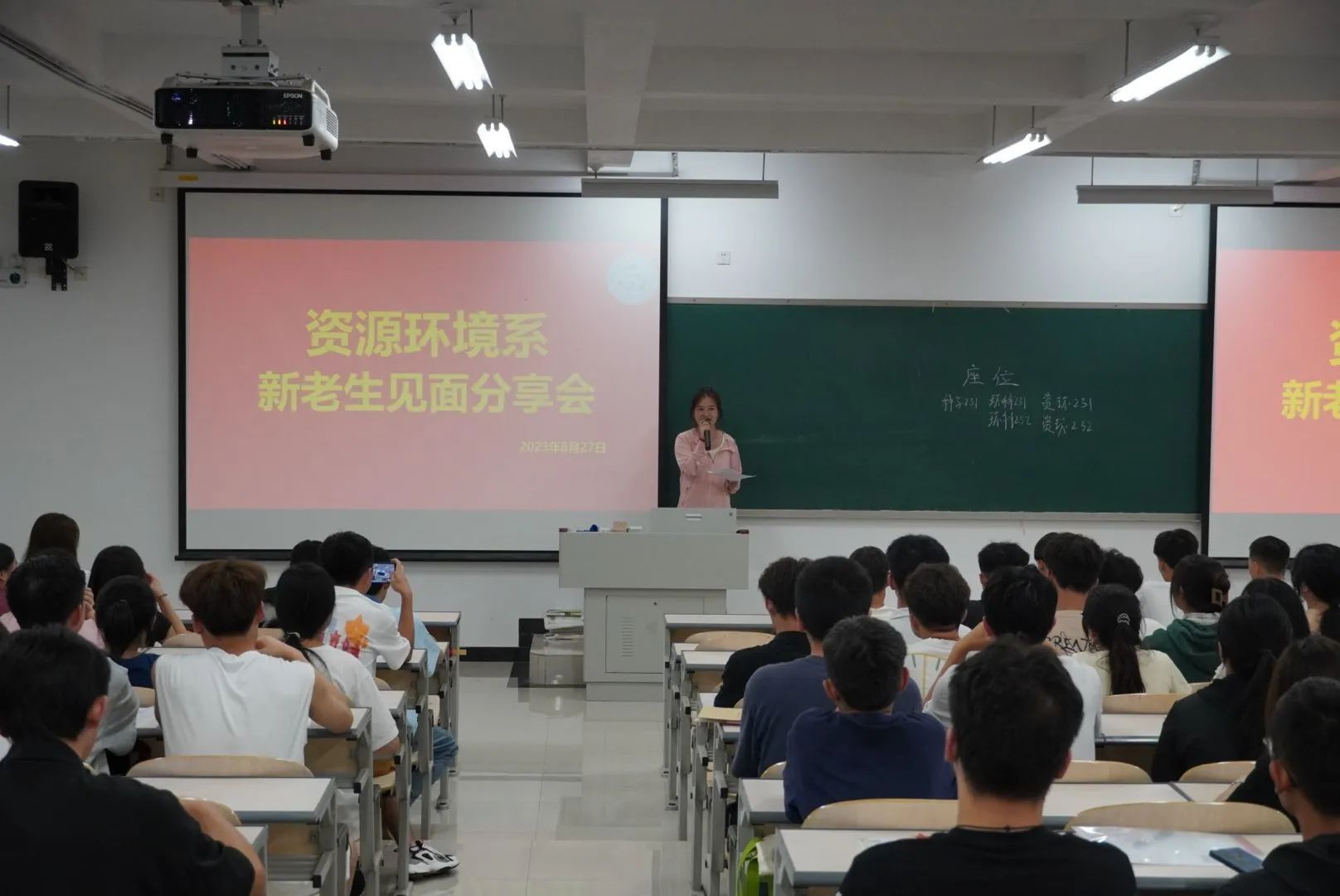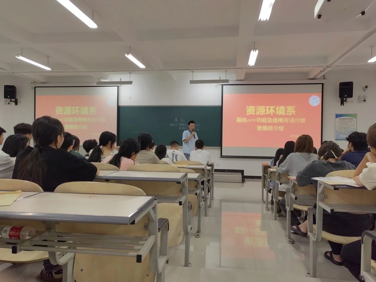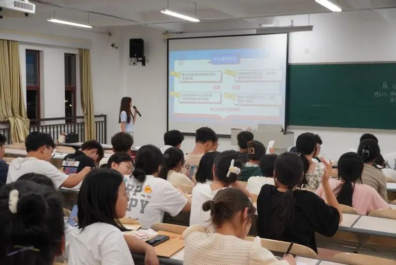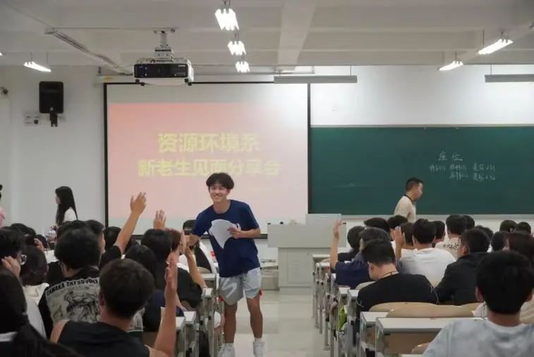 为让新同学们更快适应大学生活,了解学分设置,资源环境系团总支,学生会,易班学生工作分站的学姐学长们带着大学生活“锦囊妙计”于8月27日,举行了2023级新老生见面会。大会开始资源环境系2023级辅导员马丽莎老师对新生的到来表示了欢迎,并强调了今年会官方网站本科生行为规范以及进行了网络思想政治教育。随后资源环境系团总支、学生会、易班学生工作分站的学姐学长们分别给新同学们介绍了学校设置,校园环境,图书馆使用规范,以及第二课堂积分相关信息,入团流程,易班APP功能使用。