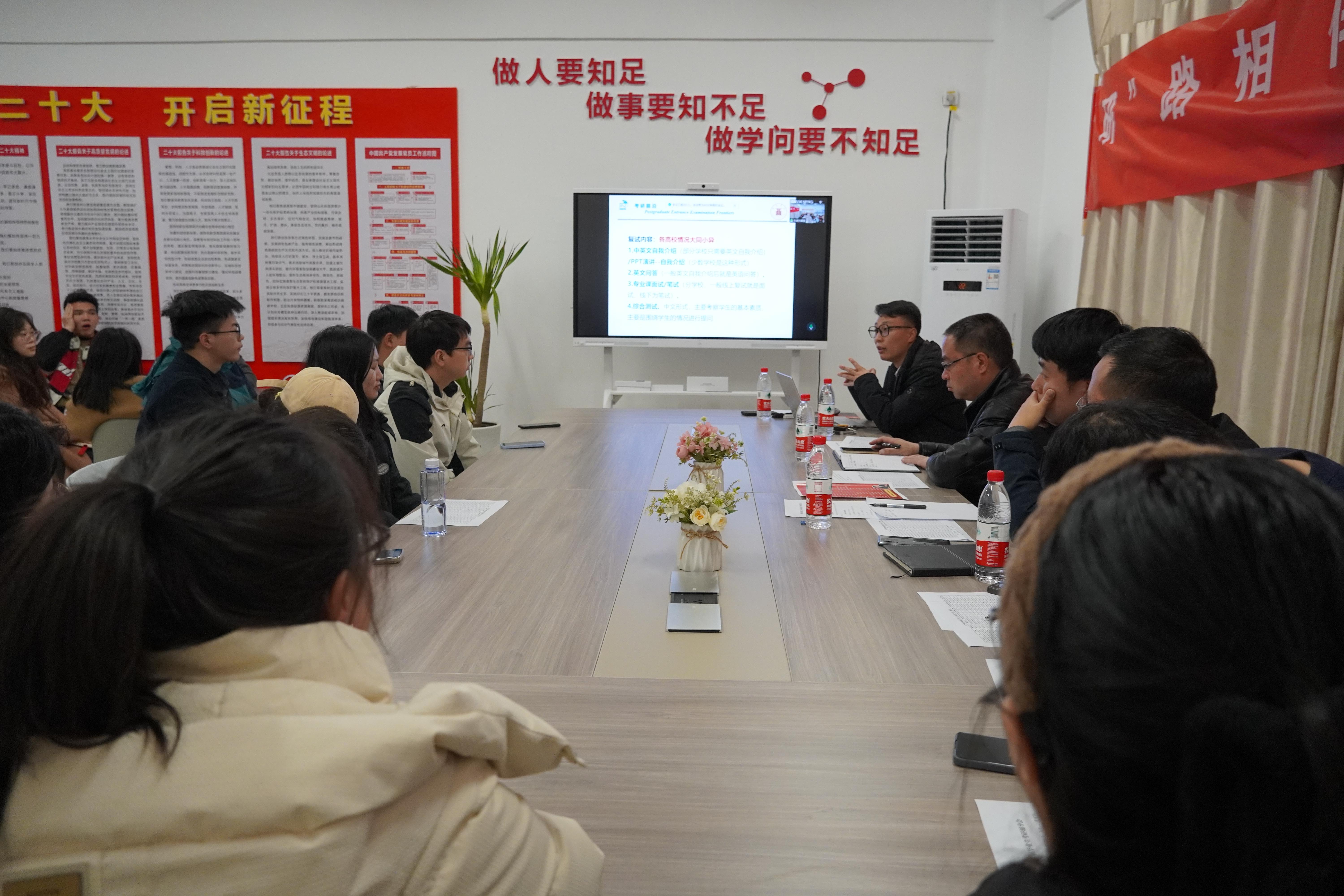 冯华仲老师肯定了同学们前期为考研所付出的努力,勉励学生们坚定信心、沉着应对,总结经历优势,关注官方信息,积极与老师沟通,做足做好面试和调剂准备。何兴华老师做了考研面试主题培训。他从考研面试的各个环节入手,详细地介绍了面试的流程、需要准备的材料,重点就如何与导师有效沟通、如何制作个人简历、如何在面试中做好自我介绍等关键环节进行了分析。杨应增老师做了考研调剂主题培训。他详细介绍了研究生调剂政策和流程,提示同学们需要密切关注学校的调剂政策、具体要求和时间节点,及时准备相关材料;要积极主动沟通,尽最大努力争取调剂机会。