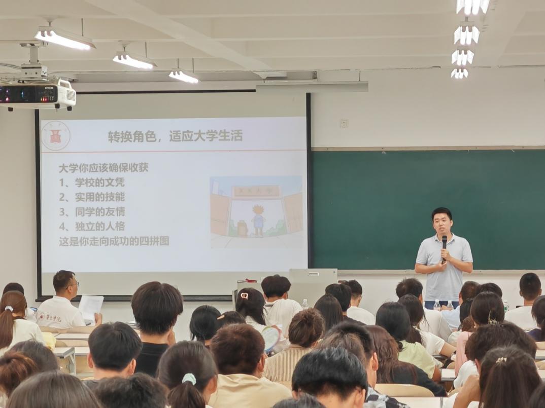 冯华仲老师作校情系情介绍,从学校专业设置、学生科研、师生服务地方、教学成效及优秀毕业生等方面进行了讲解,让学生快速熟悉学校和系部,鼓励大家向优秀同辈学习。