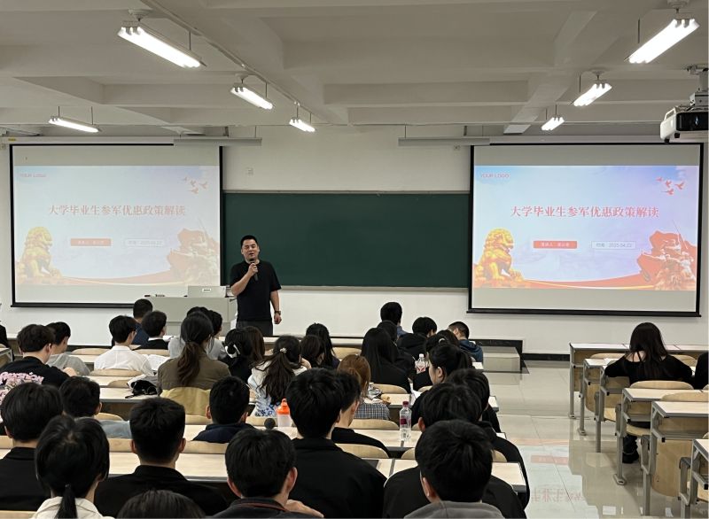 黄训星老师就征兵政策、就业形势两方面作动员讲话,强调青年学子应胸怀家国,把握参军入伍与高质量就业的双重机遇,认清就业形势,树立正确的职业观,保持积极健康的求职心态。