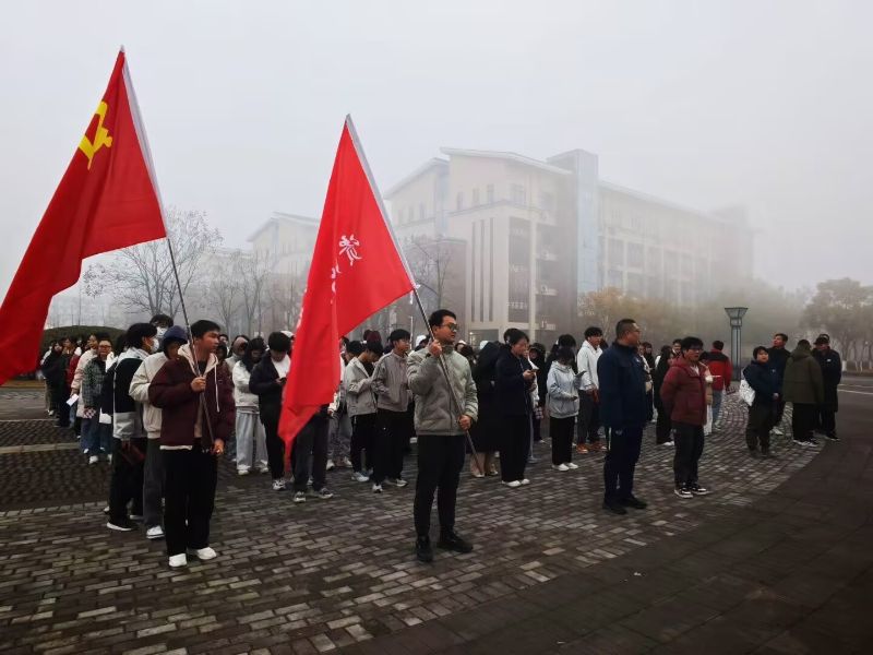 口号誓师:栾康老师上前,带领师生高喊:重温长征路,青春砺初心!短促口号在晨风里叠成一片。随即“出发”令下,党旗领跑,院旗紧随;晨雾被脚步划破,两面旗帜一前一后引领队伍向前,“团结、坚持、必胜”的信念伴着节奏悄悄落进每个人的胸膛,晨跑正式启程。