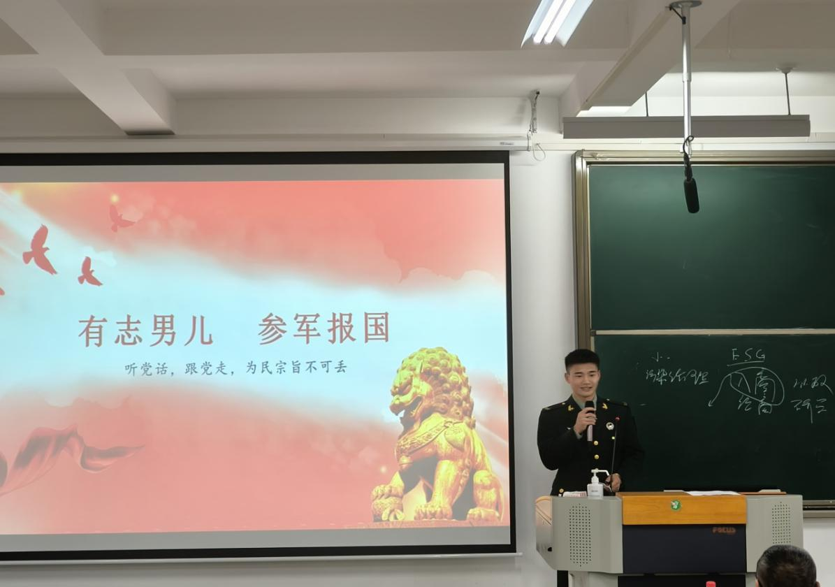 最后,退伍军人陈双同学为大家讲解了应征入伍的基本条件、政策及各种福利待遇,并讲述了自己的军旅生活,鼓励2024届毕业生们踊跃报名参军,为祖国的国防事业贡献青春力量!