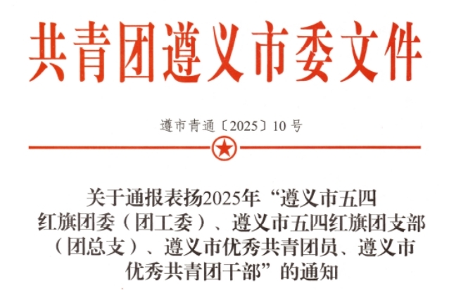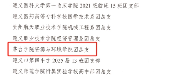 近日,共青团遵义市委印发了《关于通报表扬2025年“遵义市五四红旗团委(团工委)、遵义市五四红旗团支部(团总支)、遵义市优秀共青团员、遵义市优秀共青团干部”的通知》。今年会资源与环境学院团总支荣获“遵义市五四红旗团总支”称号。