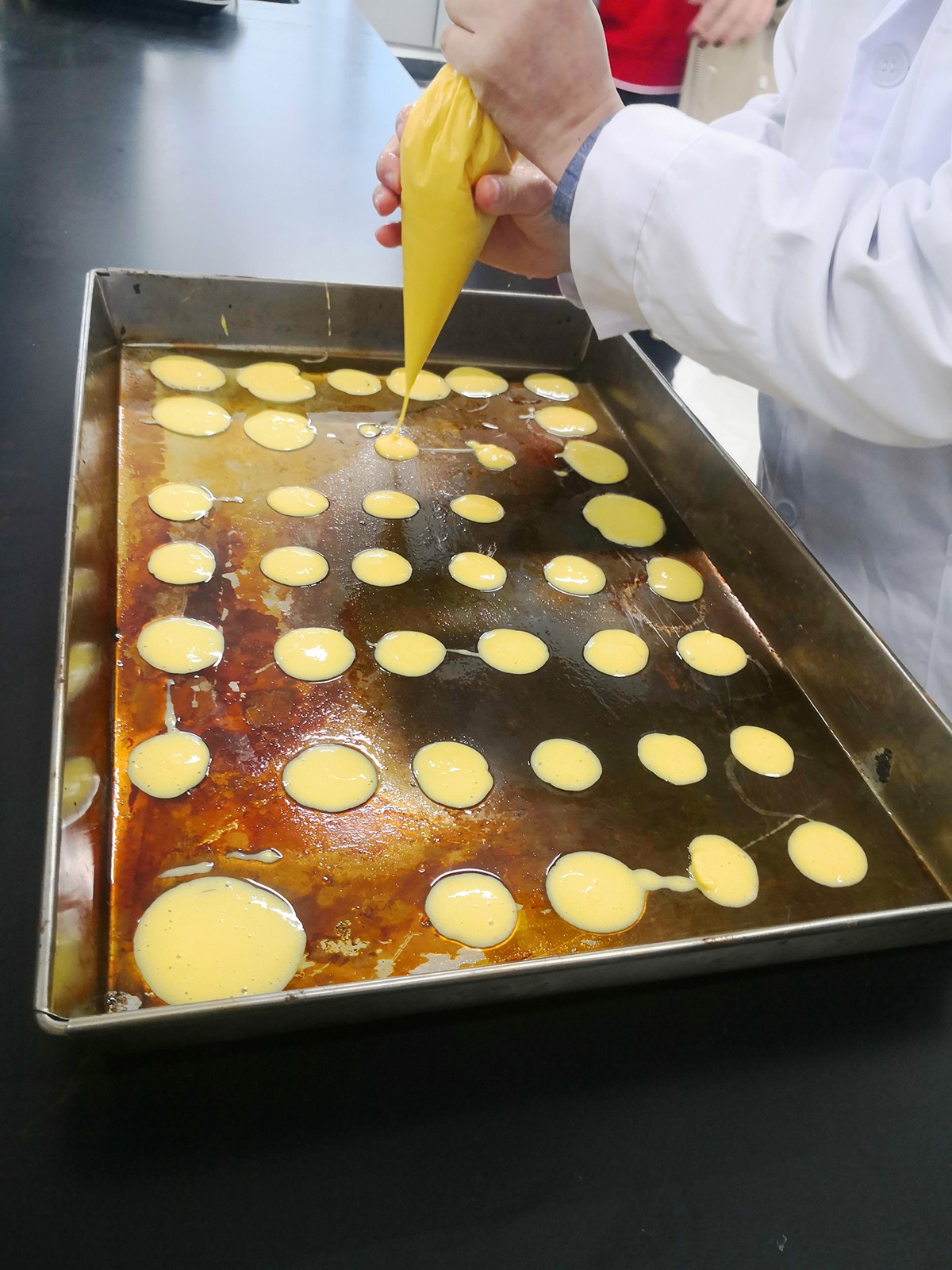 这是一场趣味性实验活动,老师们穿上实验服,撸起袖子认真操作着每一步环节,原辅料预处理、称量、配料、搅拌、注模、烘烤,最后切块,全过程体验制作方法和要领,活动氛围温馨热闹。