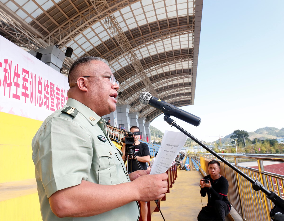 军训汇报表演结束后,军训团政委李增驰对本次军训作了总结讲话。李增驰代表全体参训教官向圆满完成军训任务的老师和同学们表示热烈的祝贺。他在讲话中指出,特长靠自我培养,智力靠自我开发,人格靠自我塑造,身心靠自我磨练。军训虽苦,但它的影响是深远的,希望同学们继续将这宝贵的精神财富发扬光大,不忘初心,继续前进。