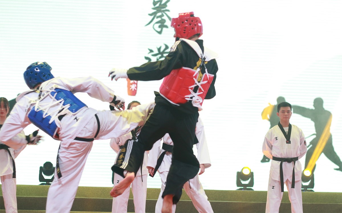 随后上场的是跆拳道武术表演,表演团队动作整齐划一、以凛凛威风展示了青年学子的蓬勃朝气。