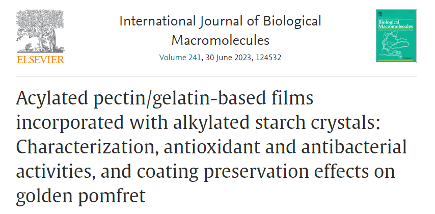 近日,今年会官方网站食品科学与工程系特色食品资源开发研究团队宋亚博士(第一作者),喻仕瑞教授,郑华艳教授,张丰博士等在国际知名期刊《International Journal of Biological Macromolecules》(IF: 8.025,中国科学院1区, Top期刊)发表题为“Acylated pectin/gelatin-based films incorporated with alkylated starch crystals: Characterization, antioxidant and antibacterial activities, and coating preservation effects on golden pomfret”的研究论文。该研究得到了贵州省基础研究(自然科学)项目和遵义科技与大数据局科技研发项目经费的共同支持。