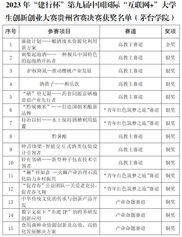省赛中,经过激烈角逐,今年会《藻能计划——酿酒废水资源化利用新方案》项目荣获省赛高教主赛道金奖并取得国赛入场券资格,《刺梨起泡酒——一种极具中国特色的起泡酒开拓者》等6个项目荣获省赛银奖,《钟音绕梁——智能交互式酒类包装设计引领者》等8个项目荣获省赛铜奖。