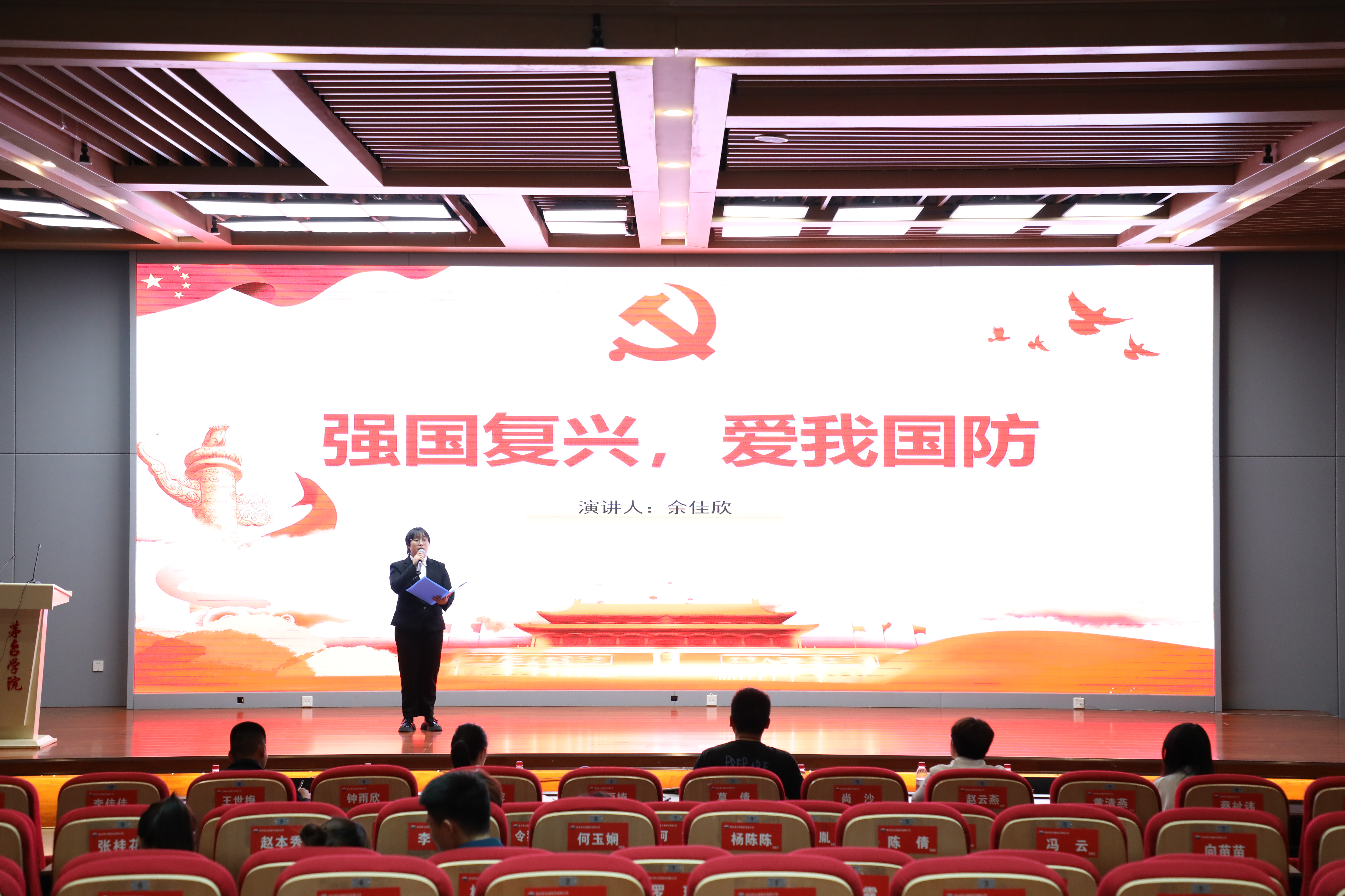 比赛现在,选手们演讲铿锵有力又真情流露,有的深切缅怀革命先烈的英雄事迹,讲述他们为国家和人民付出的血汗和生命;有人以生动的语言,讲述一个个生动的国防故事,抒发了对国防事业的真情实感,展现出青年学子的爱国情怀和责任担当。