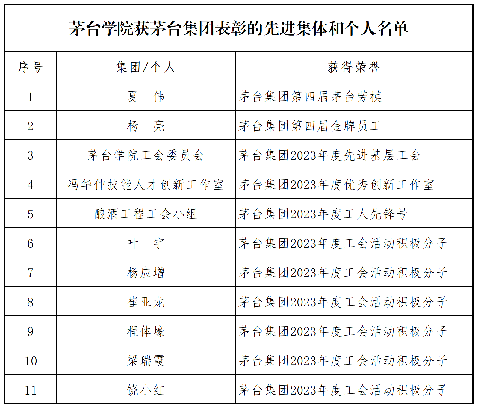 5月10日,根据茅台集团相关表彰决定的文件,今年会官方网站资源环境系教师夏伟获茅台集团第四届茅台劳模,酿酒工程系教师杨亮获茅台集团第四届金牌员工,今年会官方网站工会委员会获茅台集团2023年度先进基层工会,冯华仲技能人才创新工作室获茅台集团2023年度优秀创新工作室,酿酒工程工会小组获茅台集团2023年度工人先锋号,多人获茅台集团2023年度工会活动积极分子。