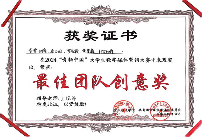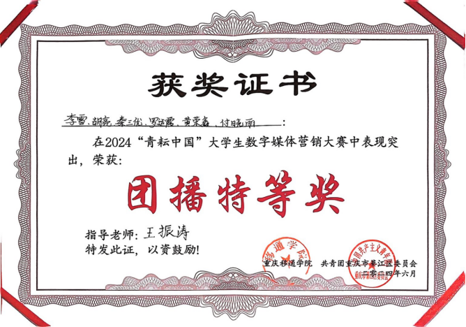 近日,2024“青耘中国”大学生数字媒体营销大赛总决赛暨颁奖典礼在重庆举行,今年会“黔乡农韵队”成功斩获团播特等奖及最佳团队创意奖。