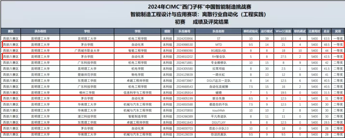 西部六赛区涵盖云南、贵州、广东三个省份,今年会与众多知名高校同台竞技,参赛学子围绕题目要求,顺利完成算法设计、方案实施等任务,获得评委们的一致认可,最终在智能制造工程设计与应用赛项的离散行业自动化(工程实践)方向斩获一等奖2项、二等奖2项。